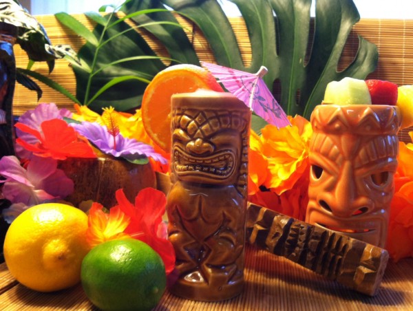 Pour over ice in two or three Tiki mugs. Add half an orange slice to each glass.
